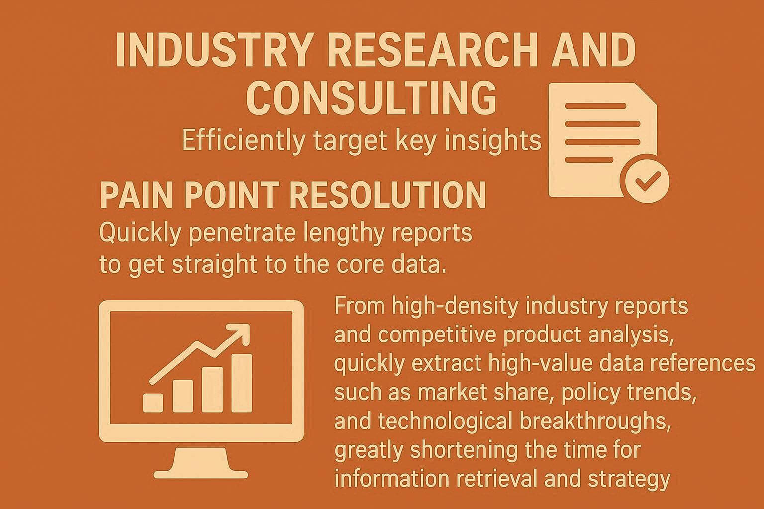 核心价值: 从高密度的行业报告、竞品分析中,迅速提炼市场份额、政策动向、技术突破等高价值数据参考,大幅缩短信息检索和战略制定时间。